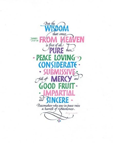 Who is a wise man and endued with knowledge among you? let him shew out of a good conversation his works with meekness of wisdom. But if ye have bitter envying and strife in your hearts, glory not, and lie not against the truth. This wisdom descendeth not from above, but is earthly, sensual, devilish. For where envying and strife is, there is confusion and every evil work. But the wisdom that is from above is first pure, then peaceable, gentle, and easy to be intreated, full of mercy and good fruits, without partiality, and without hypocrisy. And the fruit of righteousness is sown in peace of them that make peace.”